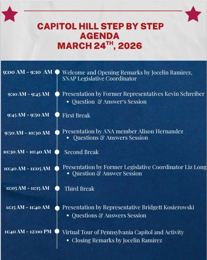 The Student Nurses’ Association of Pennsylvania (SNAP) invites you to join us virtually on Tuesday, March 24, 2026, for our annual Capitol Hill Step-By-Step Day! This is a day for student nurses to explore the world of legislation, the political process, and the ways in which student nurses can influence the outcome of legislation. The event will include a series of passionate speakers who have first-hand experience with the legislative process and the nursing profession. This year’s Capitol Hill Step by Step event will be conducted virtually via Zoom. The event will allow for student interaction with the guest speakers while also giving flexibility with time and travel. The program begins at 9:00 a.m. and will conclude by 12:00 noon. We hope you can join us for this exciting educational opportunity!